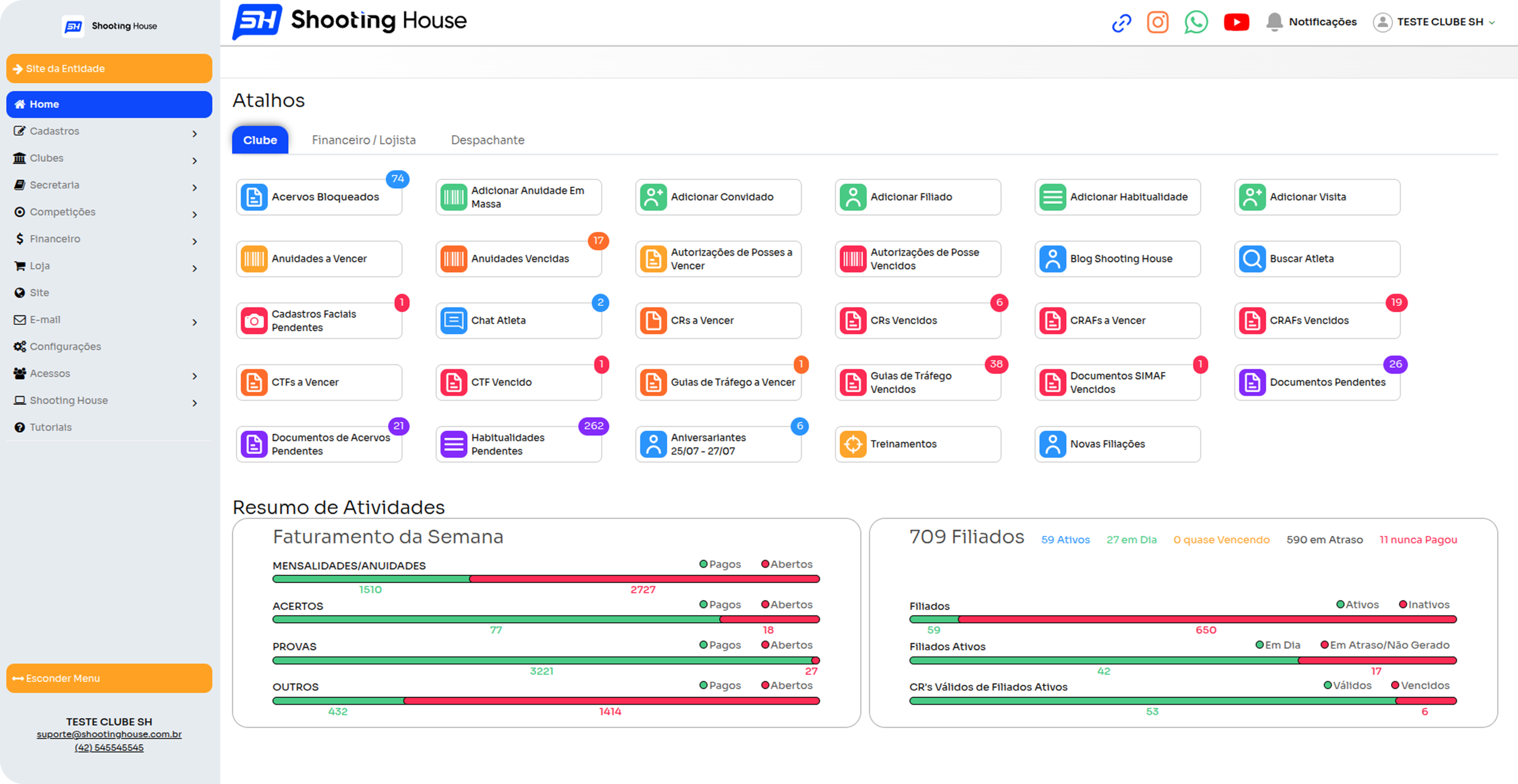 Transforme a administração do seu clube com uma plataforma completa para agendamentos, treinos, documentos e controle de armamentos — tudo em um só lugar, com segurança e conformidade.